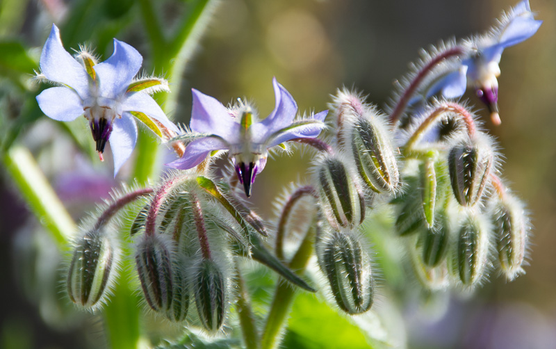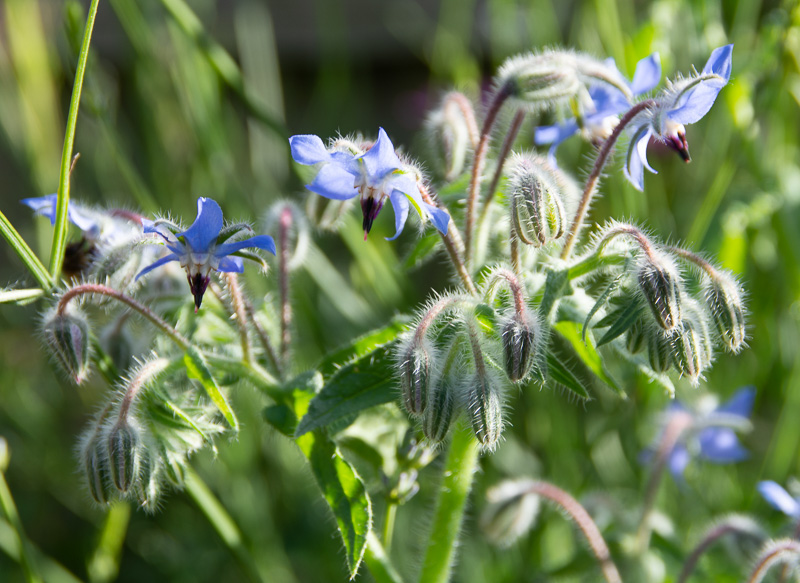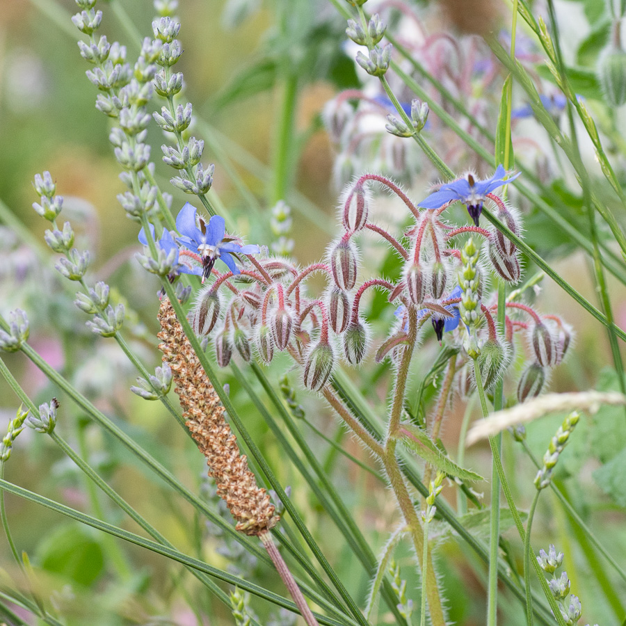 July has an abundance of blooms, following June’s rose season. This month the garden has hues of blue from the petals of Borage.